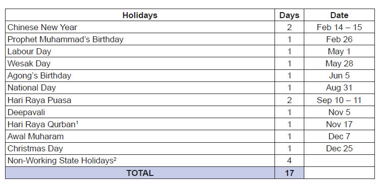 2 This is the average number of paid state holidays for the sixteen states of Malaysia.