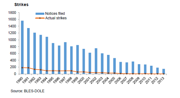 Disruptive labor action has almost disappeared in recent years, as shown in Figures 185 and 186. The incidence of labor strikes has declined steadily since a high in the years immediately after the fall of the dictator president Marcos in 1986. In recent years, very few actual strikes have taken place, and most lasted for only a few days. Notices of strikes have been much higher than actual strikes. However, preventive mediation action has usually resolved issues without workers going on the picket line. Increasingly, labor and management in the country have been able to resolve differences without the disruption of business operations.