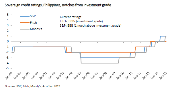 View original figure hereOther measures of macroeconomic performance are sovereign ratings of Philippine government long-term foreign currency bonds by leading rating agencies, which judge the factors that determine the quality of debt instruments in terms of notches below or above investment grade. Because the ratings reflect the agencies’ assessments of the macroeconomic management of the economy, they influence the interest rate the government pays to borrow foreign currency. The ratings for the last decade by Fitch, Moody’s, and Standard & Poor’s appear in Figure 198. Table 78 shows the ratings for the ASEAN-6 in mid-2010, when the Philippines was rated the lowest, close to Vietnam.