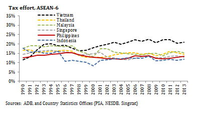The Philippine tax effort as a percent of GDP peaked in 1997 at 17% and is currently only 12.8%. While this is not greatly different than the other ASEAN-6 economies except for Vietnam (see Figure 208), when combined with low private sector investment, it restrains economic growth. With a population soon to reach 100 million and crowded and dilapidated physical and social infrastructure, there is inadequate funding available in the budget for physical and social infrastructure. Also, the tax effort in 2009 is only 0.4 percentage point higher than the rate in 2004 when the country almost slumped into a full-blown fiscal crisis.