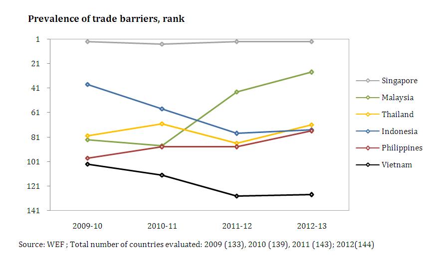 The Philippines is also low-ranked among the ASEAN-6 for its prevalence of trade barriers rank (see Figure 219).