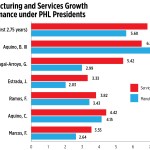 The red bar shows the growth of the Service sector and the blue bar shows the growth rate of the Manufacturing sector for each presidential watch. Note that the blue bar is always shorter than the red bar except during PNoy’s watch. Under Aquino III’s watch, Manufacturing was leading the growth of the economy: it was a growth characterized not only by quantity but by quality. Neither the romanticized Marcos’ watch nor the deservedly admired Ramos’ watch could match.