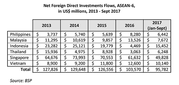 FDI remains very strong throughout Southeast Asia. Data taken from the BSP website for the first nine months of 2017 is shown in the table below and totaled $96 billion for the ASEAN-6 economies. (China reported $89 billion in the same period.)