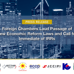 The members of the Joint Foreign Chambers laud the passage of three game changing laws, namely the amendments to the Retail Trade Liberalization Act (RA 11595), Public Service Act (RA 11659) and Foreign Investments Act (RA 11647), which are all priority reforms of the Duterte Administration. We likewise laud the recent issuance of the IRR on the Retail Trade Liberalization Act (RA 11595)after consultation with concerned stakeholders.